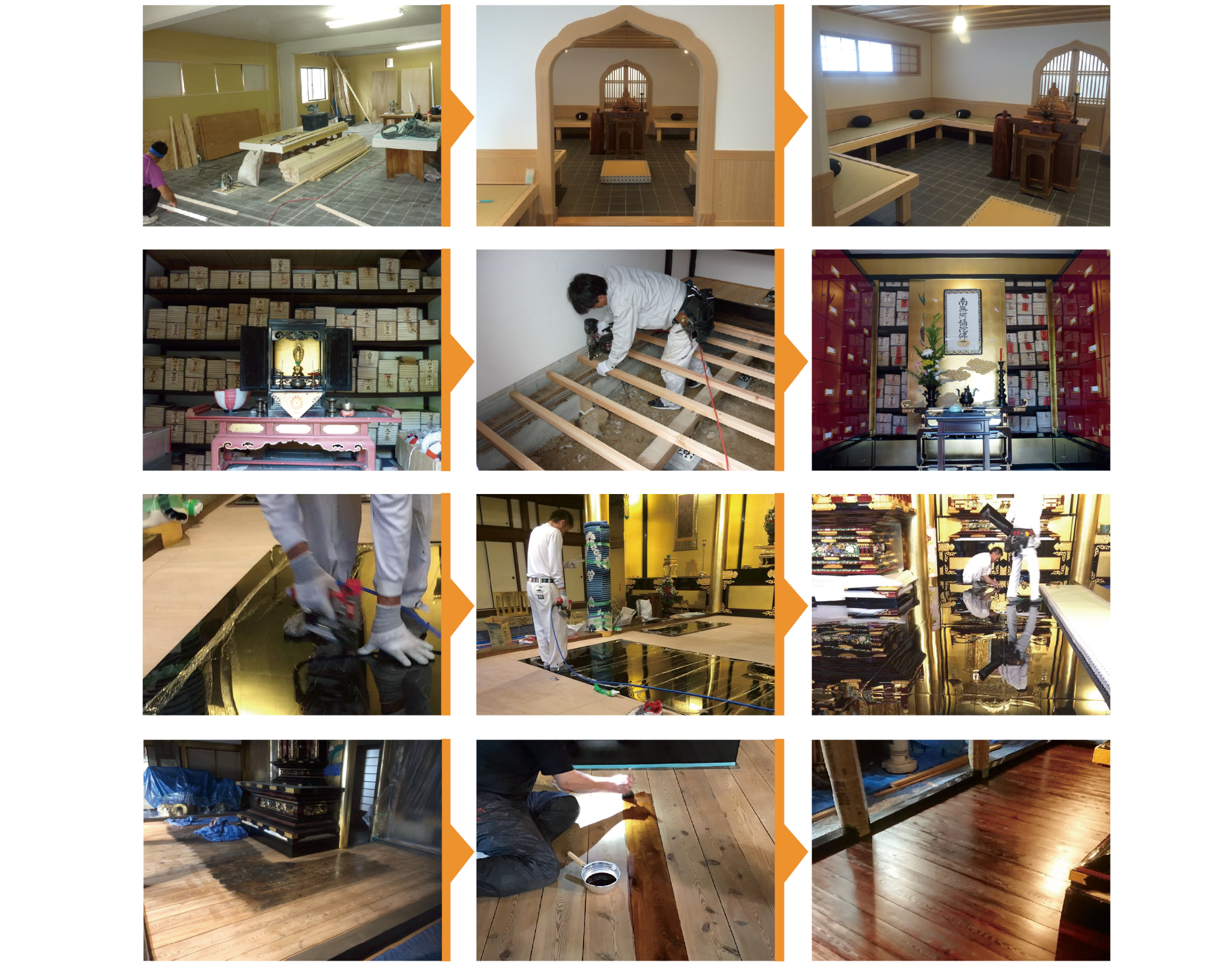 寺院リファイン工事とは、伝統技術で仕上がった部材(漆塗りの柱、長押、床板など)を現場で組み立てる工事のことをいいます。寺院様のご要望をお聞きし、設計、材の選定、施工全てを行うのが「技巧の団」です。技巧の団は、伝統工芸士をはじめとする技術集団で、京都唯心庵の総合プロデュースの元に、各職の伝統技術と施工班が融合し、無駄のない工事をさせて頂きます。また、長年に渡り油などで汚れた内陣の床板の再生や、障壁画の模写工事なども「技巧の団」で承っております。こうした伝統を大切にする部分に、現代の先進技術を加えて、本来の目的を達成することが可能となりました。